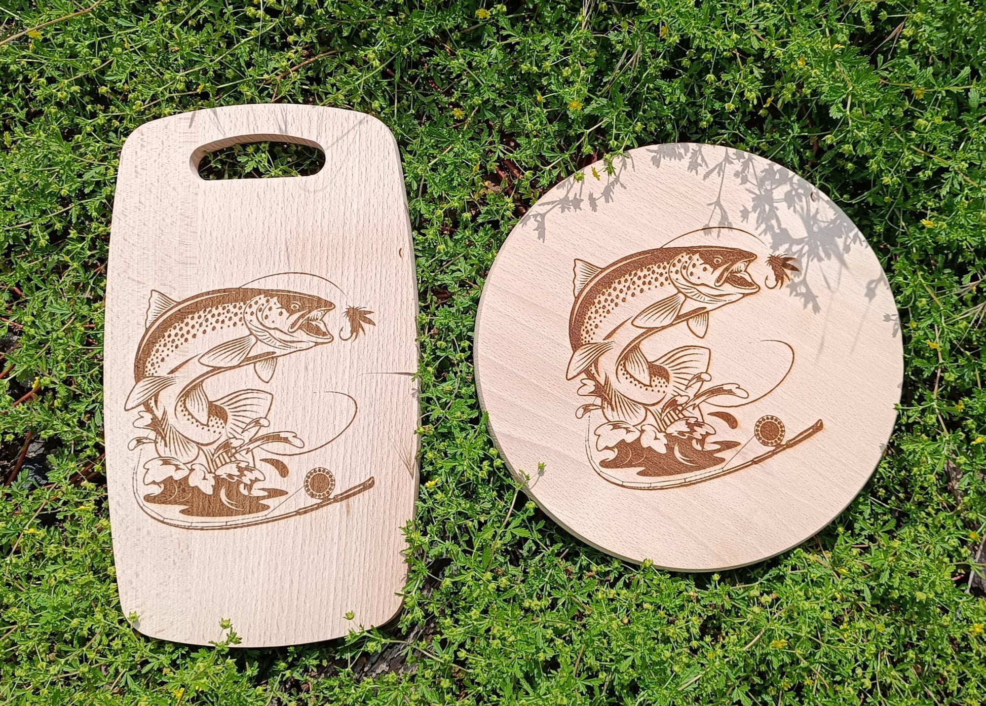 Praktický pomocník do kuchyně s motivem, který potěší každého milovníka rybaření. Toto dřevěné prkénko zdobí precizně vygravírovaný motiv ryby – detailní a stylový doplněk, který spojuje funkčnost s jedinečným designem.